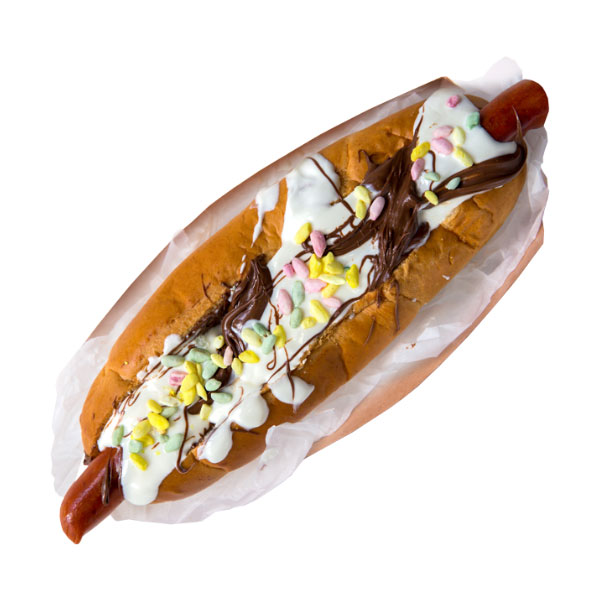 rohlík, párek, nutela, zakysaná smetana, sladký posyp